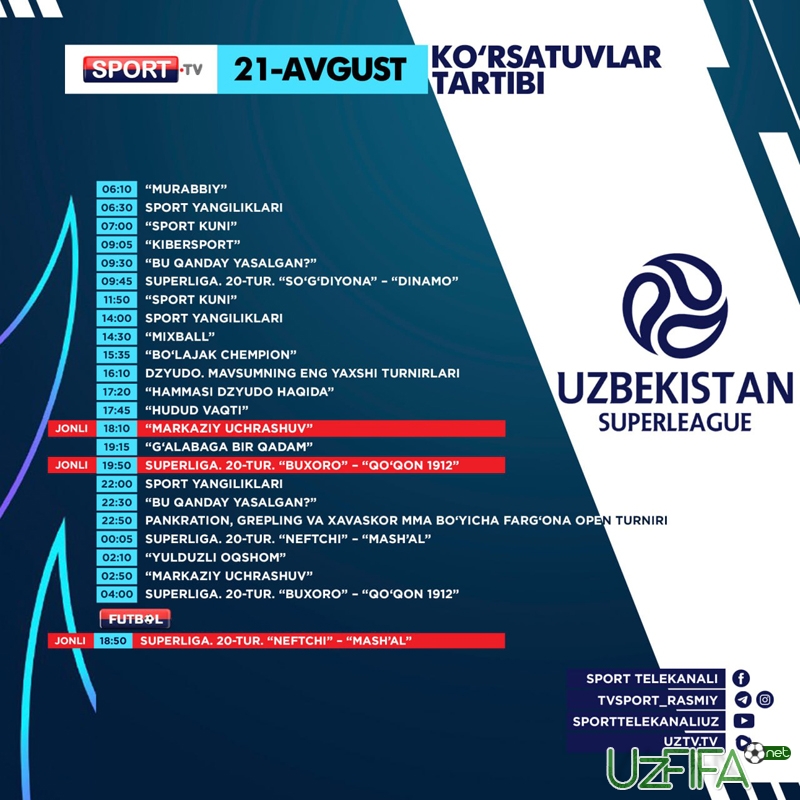 Sport va Futbol telekanallarida 21-avgust kuni 2 ta futbol translyasiyasi bor