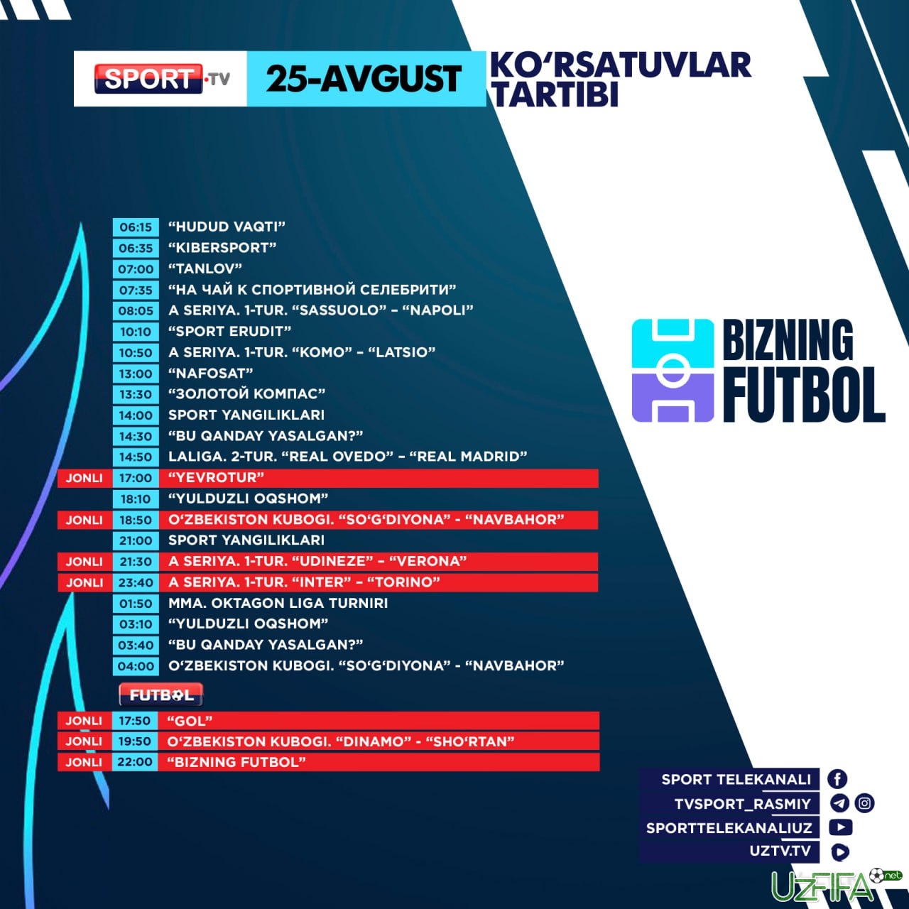 Sport va Futbol telekanallarida 25-avgust kuni 4 ta futbol translyasiyasi bor