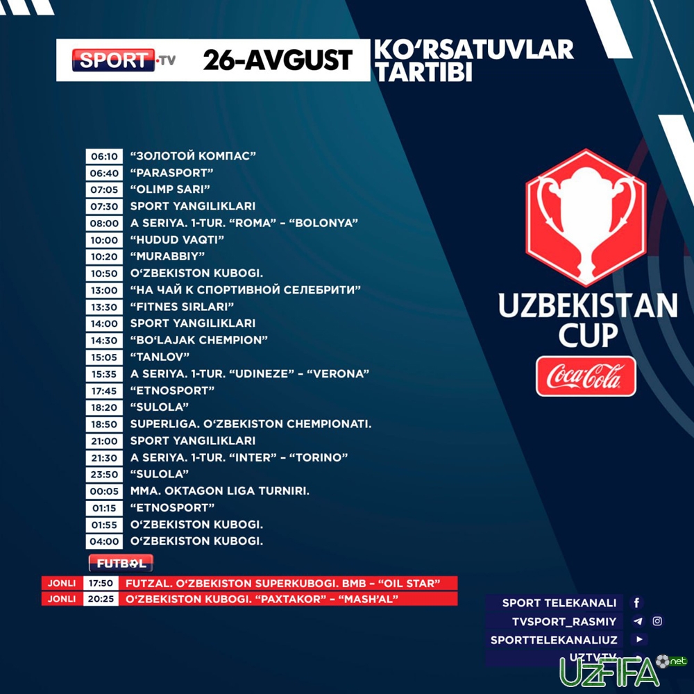 Sport va Futbol telekanallarida 26-avgust kuni futbol va futzal translyasiyalari bor
