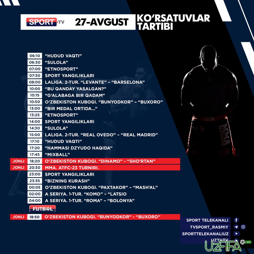 Sport va Futbol telekanallarida 27-avgust kuni 2 ta futbol translyasiyasi bor