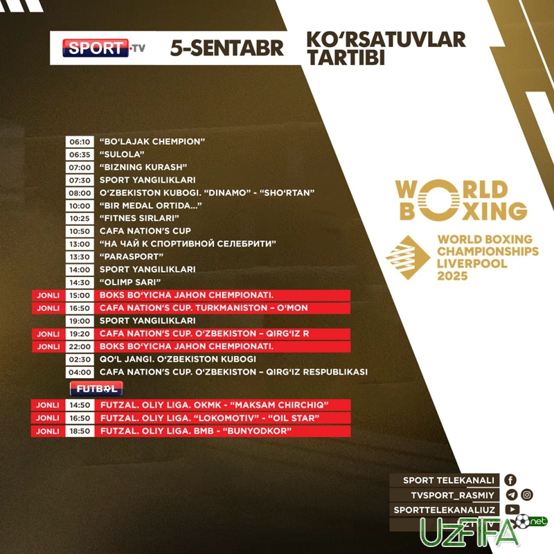 Sport va Futbol telekanallarida 4-sentyabr kuni futbol, futzal va boks bo‘yicha JCH translyasiyasi bor