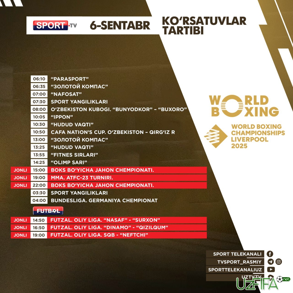 Sport va Futbol telekanallarida 6-sentyabr kuni futzal va boks bo‘yicha JCH translyasiyasi bor