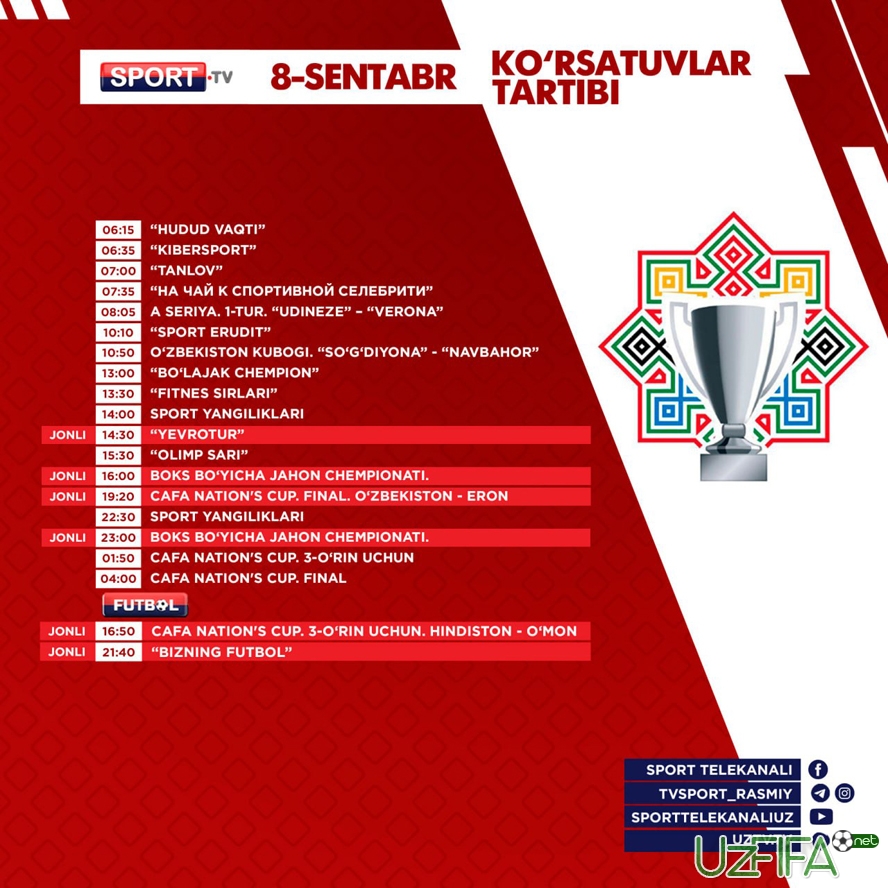 Sport va Futbol telekanallarida 8-sentyabr kuni 2 ta futbol va boks bo‘yicha JCH translyasiyalari bor