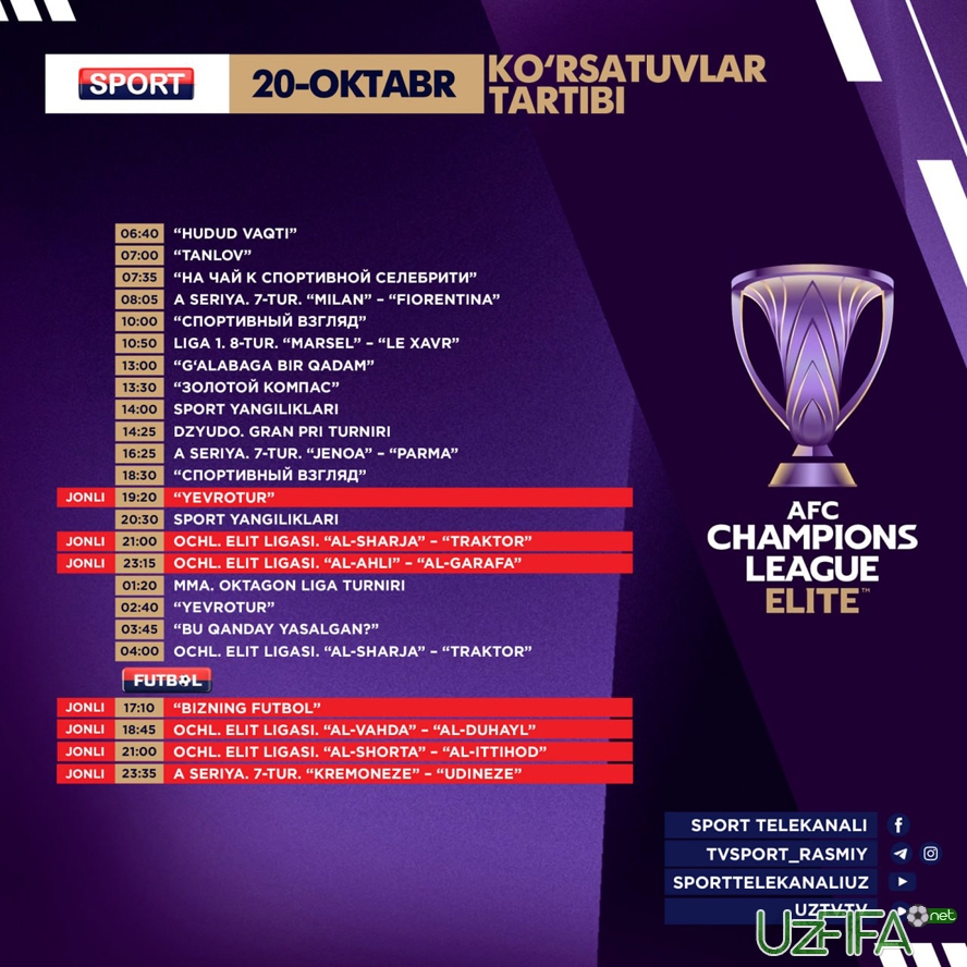Sport va Futbol telekanallarida 20-oktyabr kuni 5 ta jonli futbol translyasiyasi bor