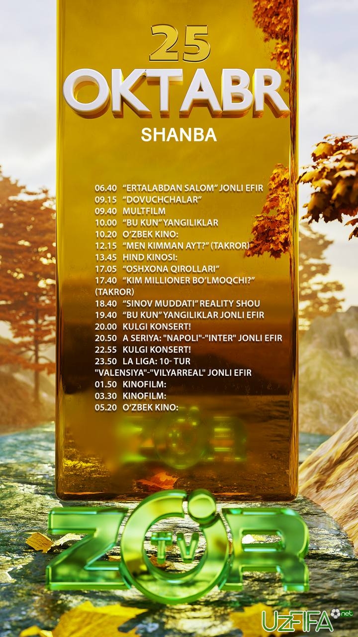 Zo'r TV telekanali 25-oktyabr kuni A seriya va La liganing bittadan o‘yinlarini jonli translyasiya qiladi