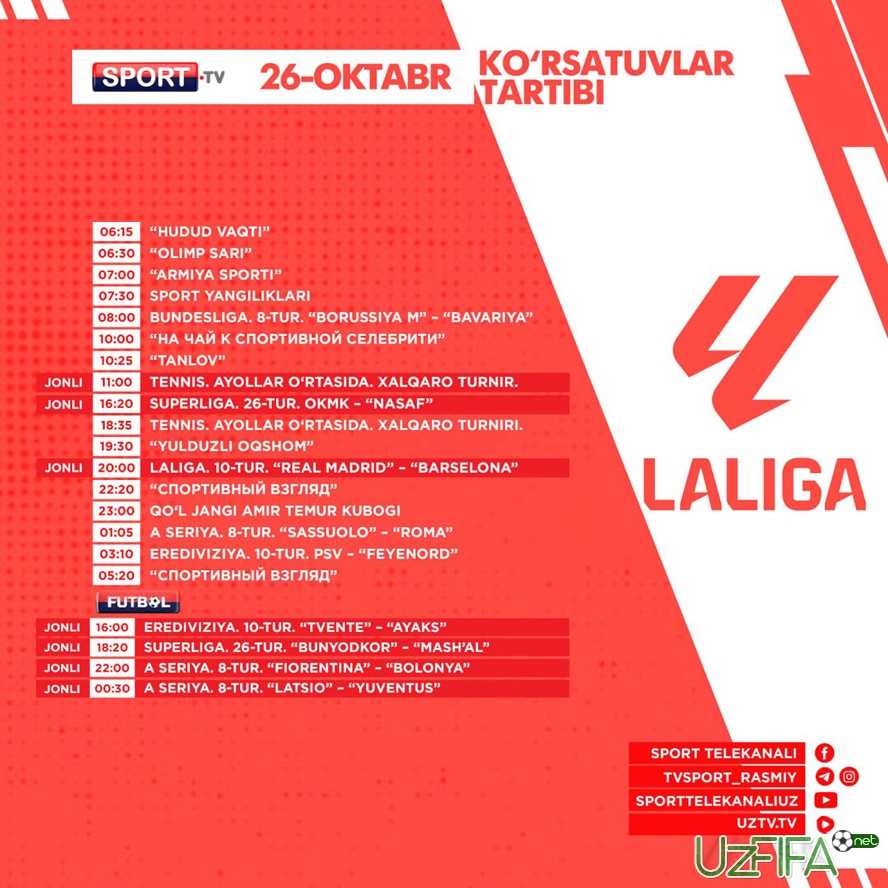 Sport va Futbol telekanallarida 26-oktyabr kuni «el-klasiko» va 5 ta jonli futbol translyasiyasi bor