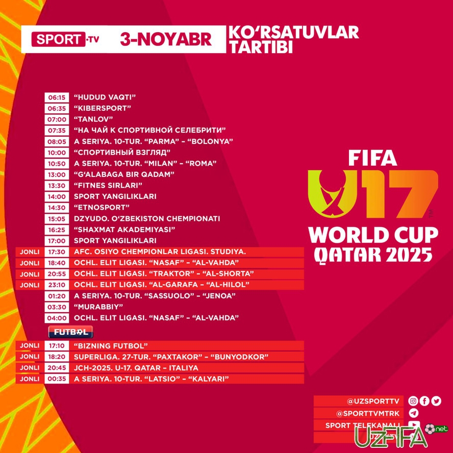 Sport va Futbol telekanallarida 3-noyabr kuni 6 ta jonli futbol translyasiyasi bor