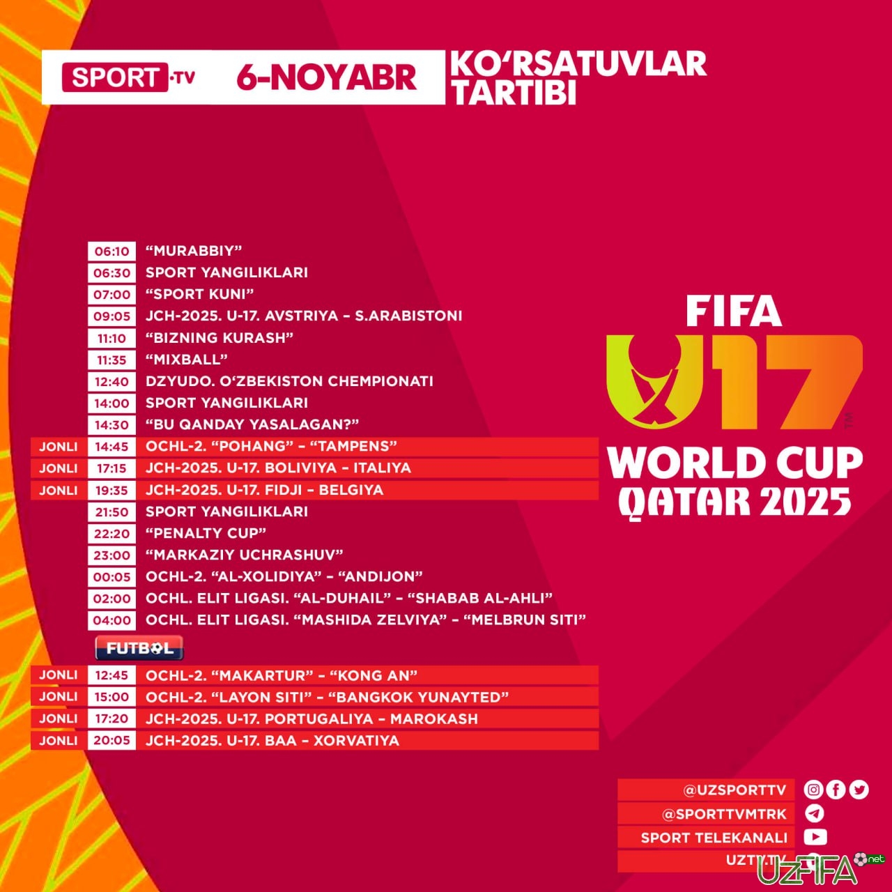 Sport va Futbol telekanallarida 6-noyabr kuni 7 ta jonli futbol translyasiyasi bor