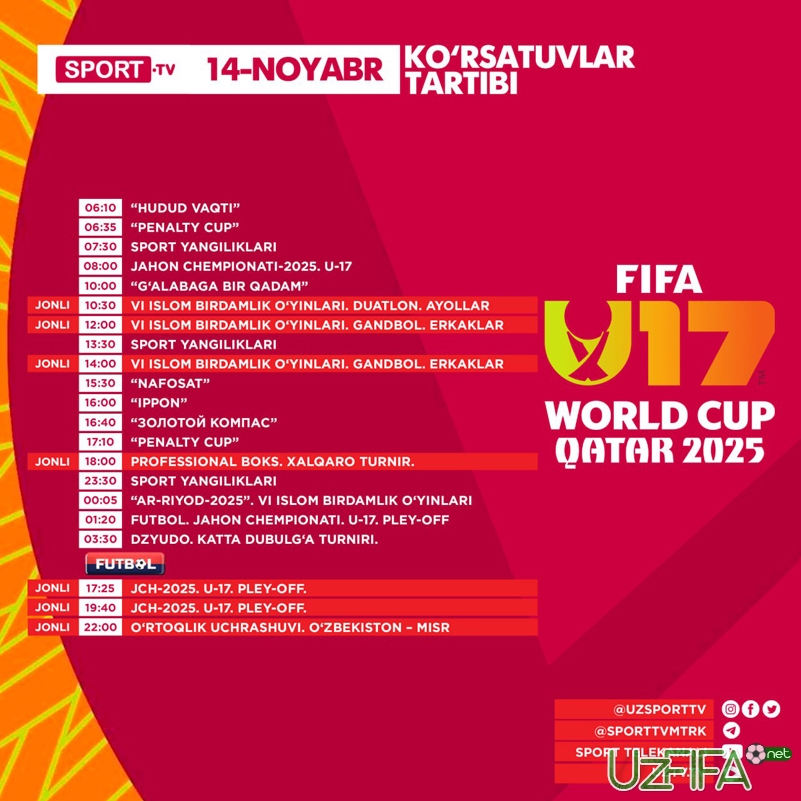 Sport va Futbol telekanallarida 14-noyabr kuni O‘zbekiston-Misr, U17 JCH uchrashuvlari va Islom birdaklik o‘yinlari translyasiyasi bor