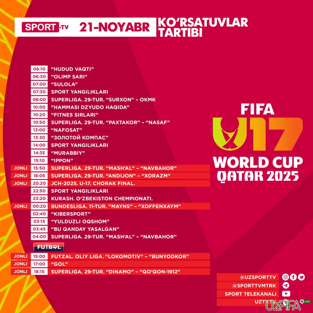 Sport va Futbol telekanallarida 21 noyabr kuni 5 ta futbol va 1 ta futzal translyasiyasi bor