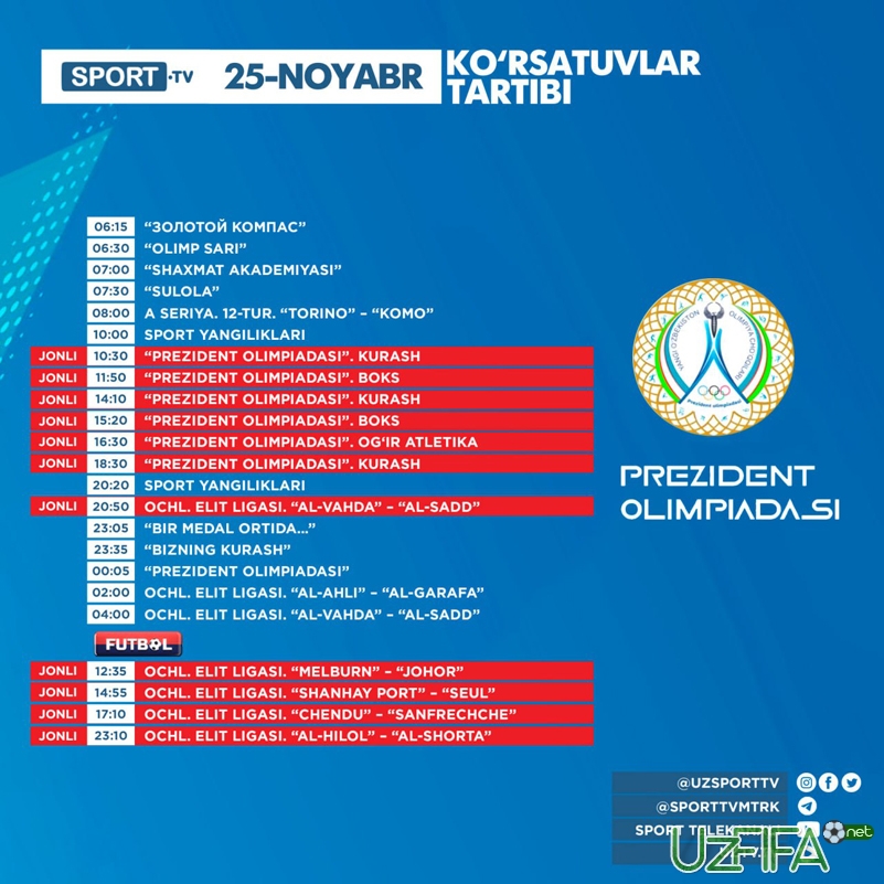 Sport va Futbol telekanallarida 25-noyabr kuni Prezident olimpiadasi hamda 5 ta futbol translyasiyasi bor