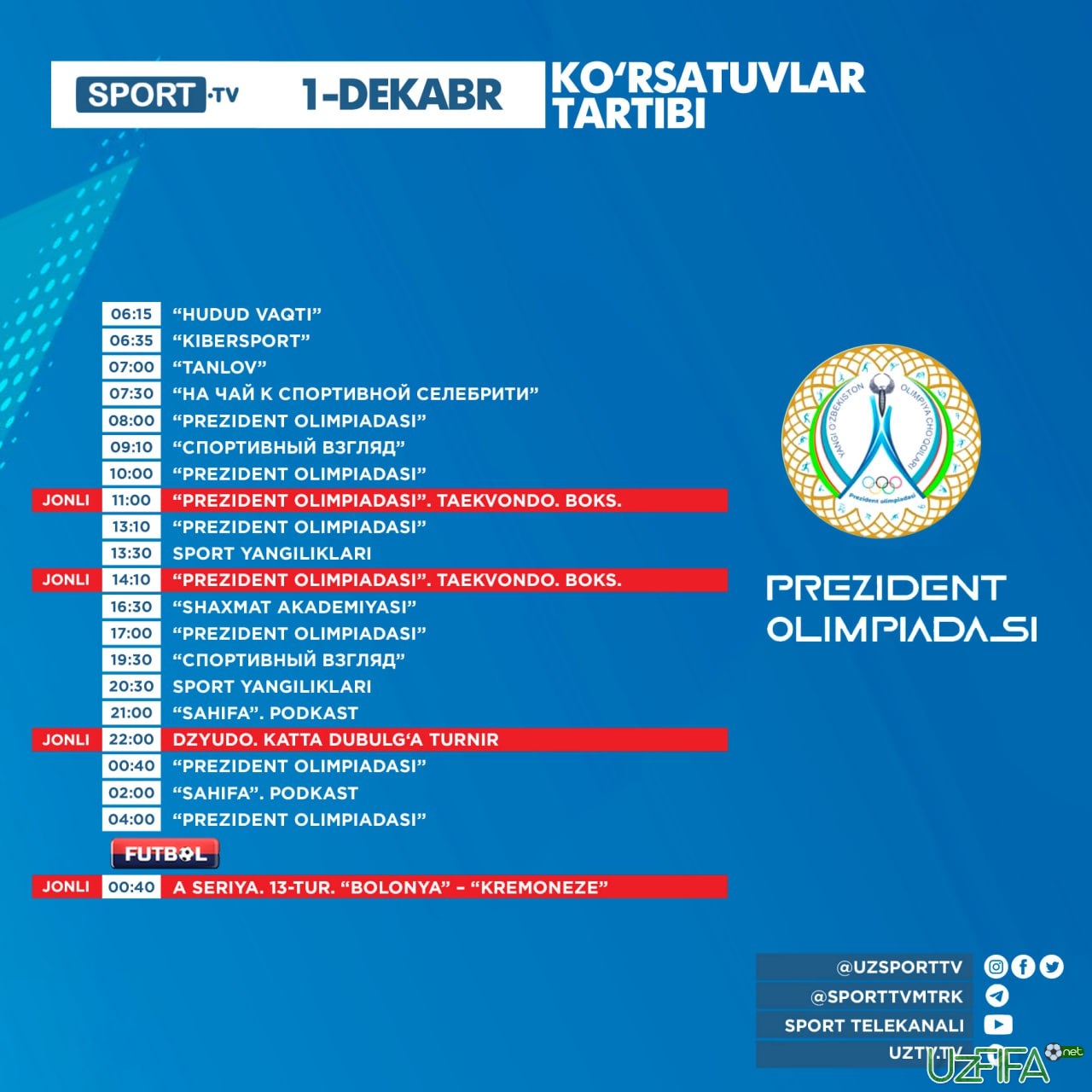 Sport va Futbol telekanallarining 1-dekabr kungi ko‘rsatuvlar dasturi