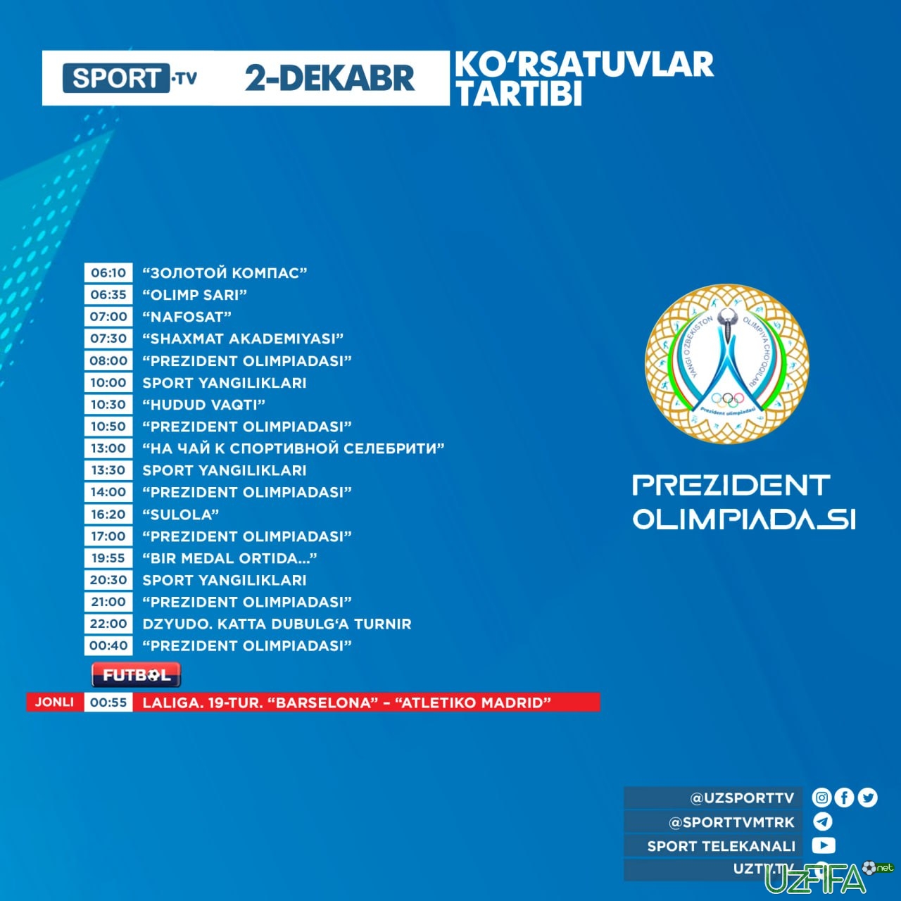 Sport va Futbol telekanallarining 2 dekabr kungi ko‘rsatuvlar jadvali