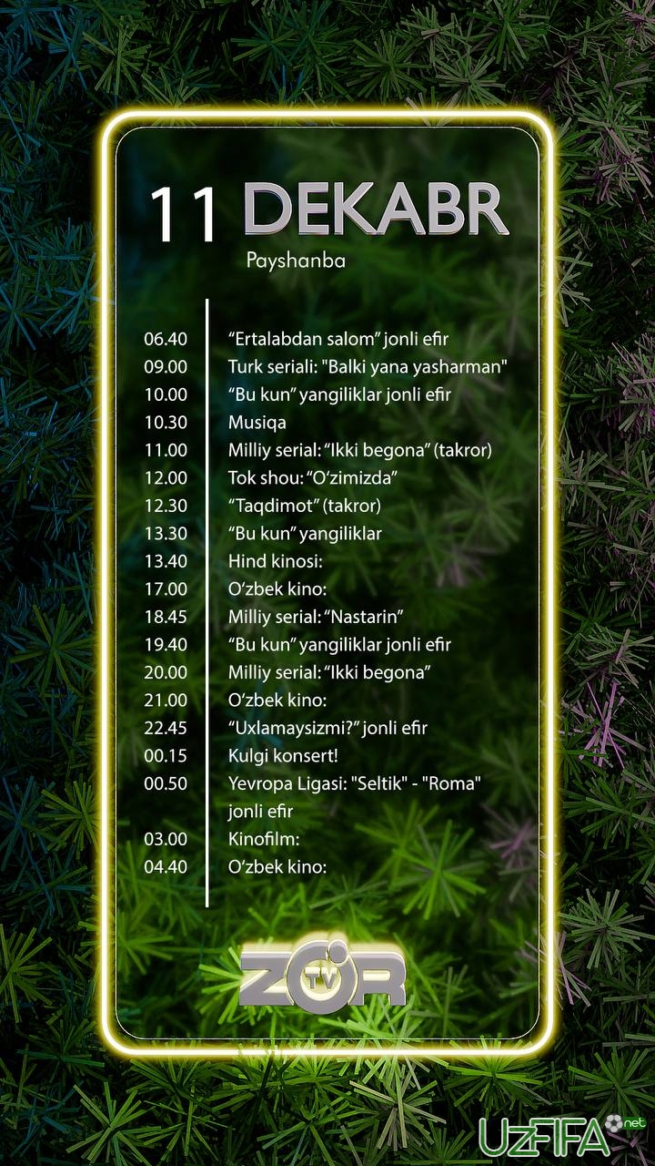 Zo'r TV telekanali 11-dekabr kuni Yevropa ligasining bitta o‘yinini jonli translyasiya qiladi