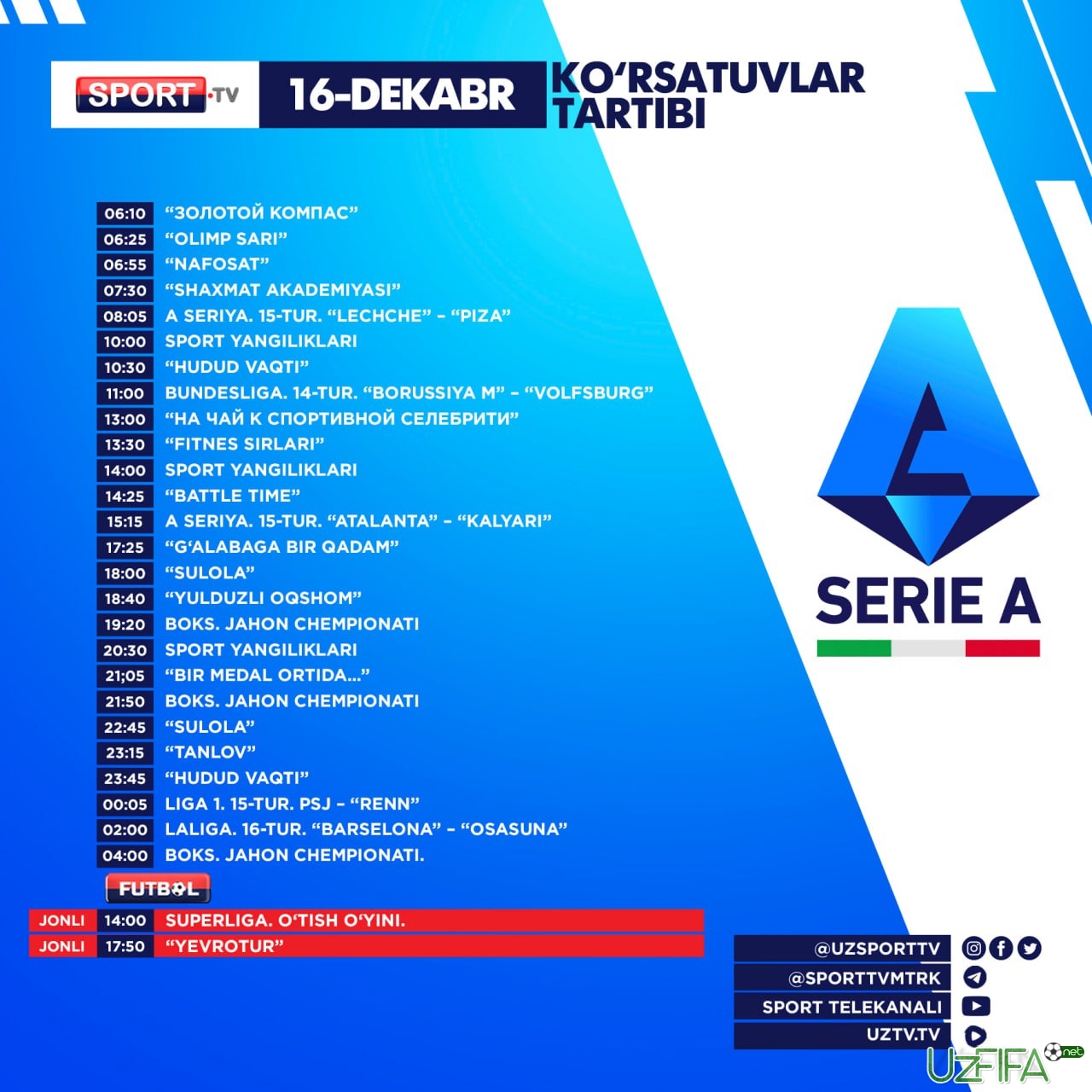 Sport va Futbol telekanallarida 16-dekabr kuni bitta futbol translyasiyasi bor