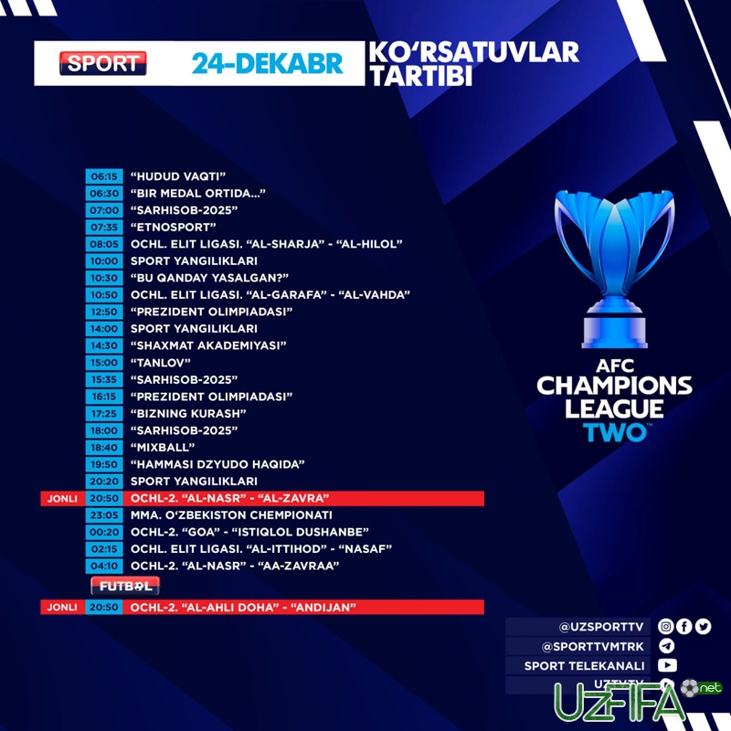 Sport va Futbol telekanallarida 24-dekabr kuni «Al-Ahli» - «Andijon» o‘yini translyasiya qilinadi