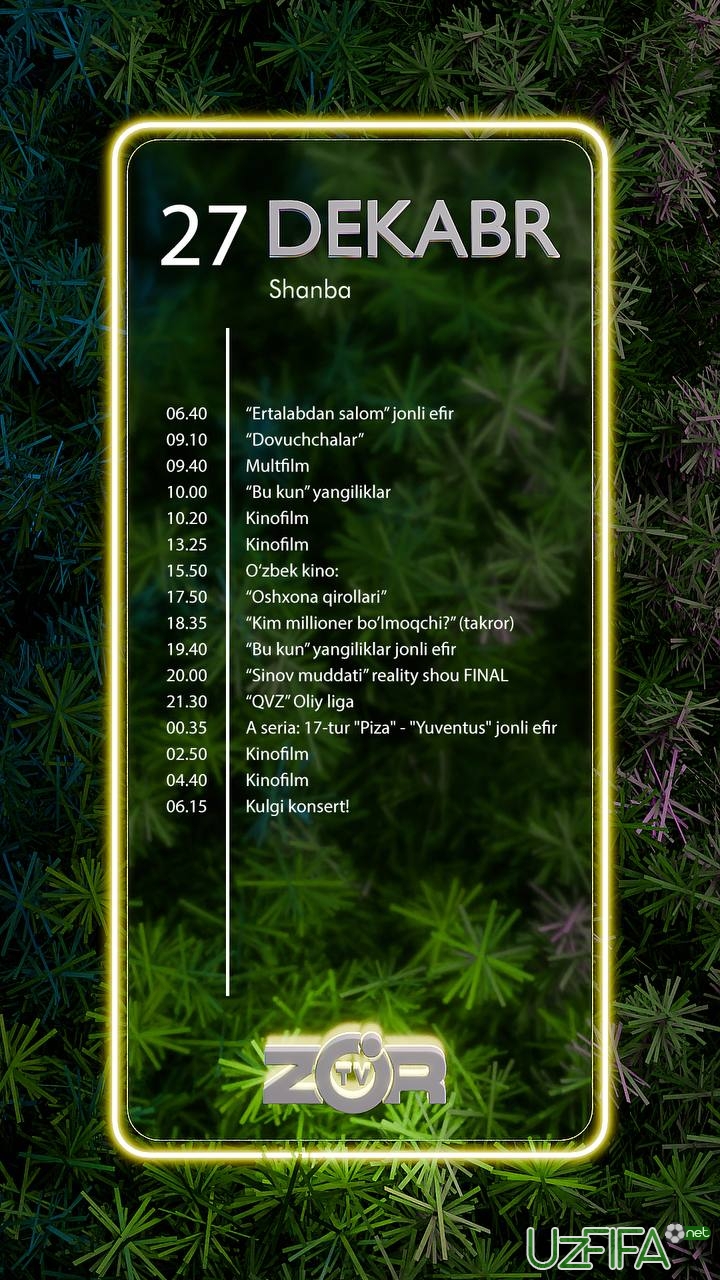 Zo'r TV telekanali 27-dekabr kuni Italiya A seriyasining bitta o‘yinini translyasiya qiladi
