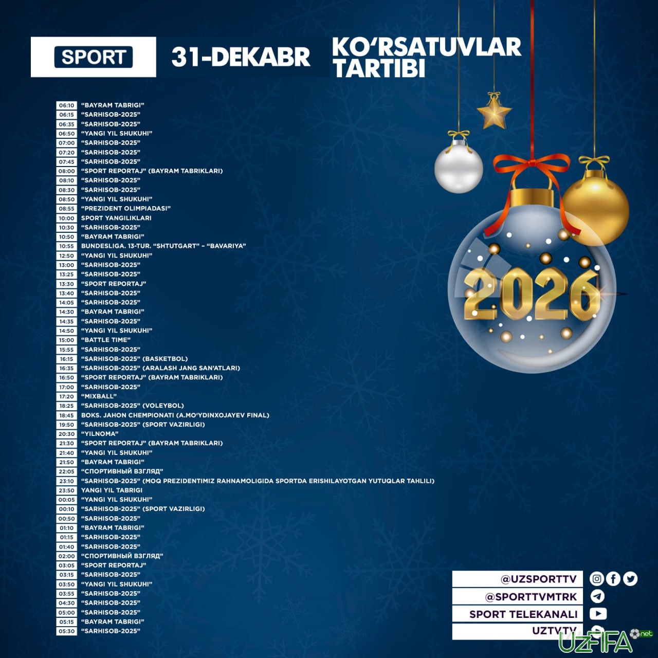 Sport telekanali 31-dekabr kungi ko‘rsatuvlar dasturi