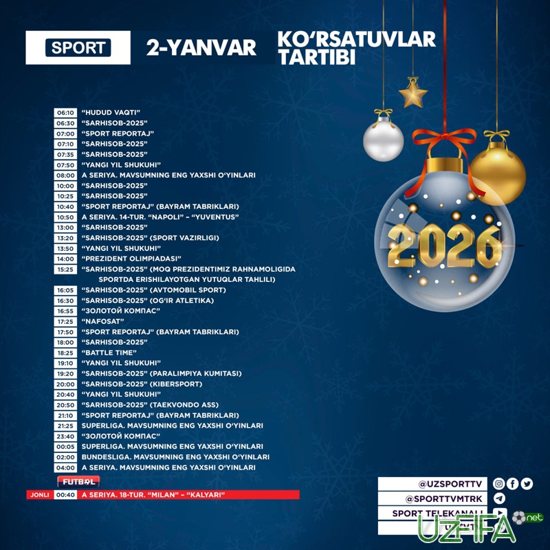 Sport va Futbol telekanallari 2-yanvar kuni Italiya chempionatining 1 ta o‘yinini translyasiya qiladi
