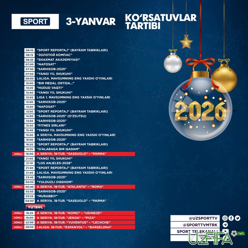 Sport va Futbol telekanallari 3-yanvar kuni Italiya chempionatining 6 ta o‘yinini translyasiya qiladi
