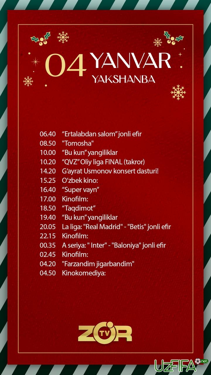 Zo'r TV telekanali 4-yanvar kuni «Real» - «Betis» va «Inter» - «Bolonya» o‘yinlarini jonli translyasiya qiladi