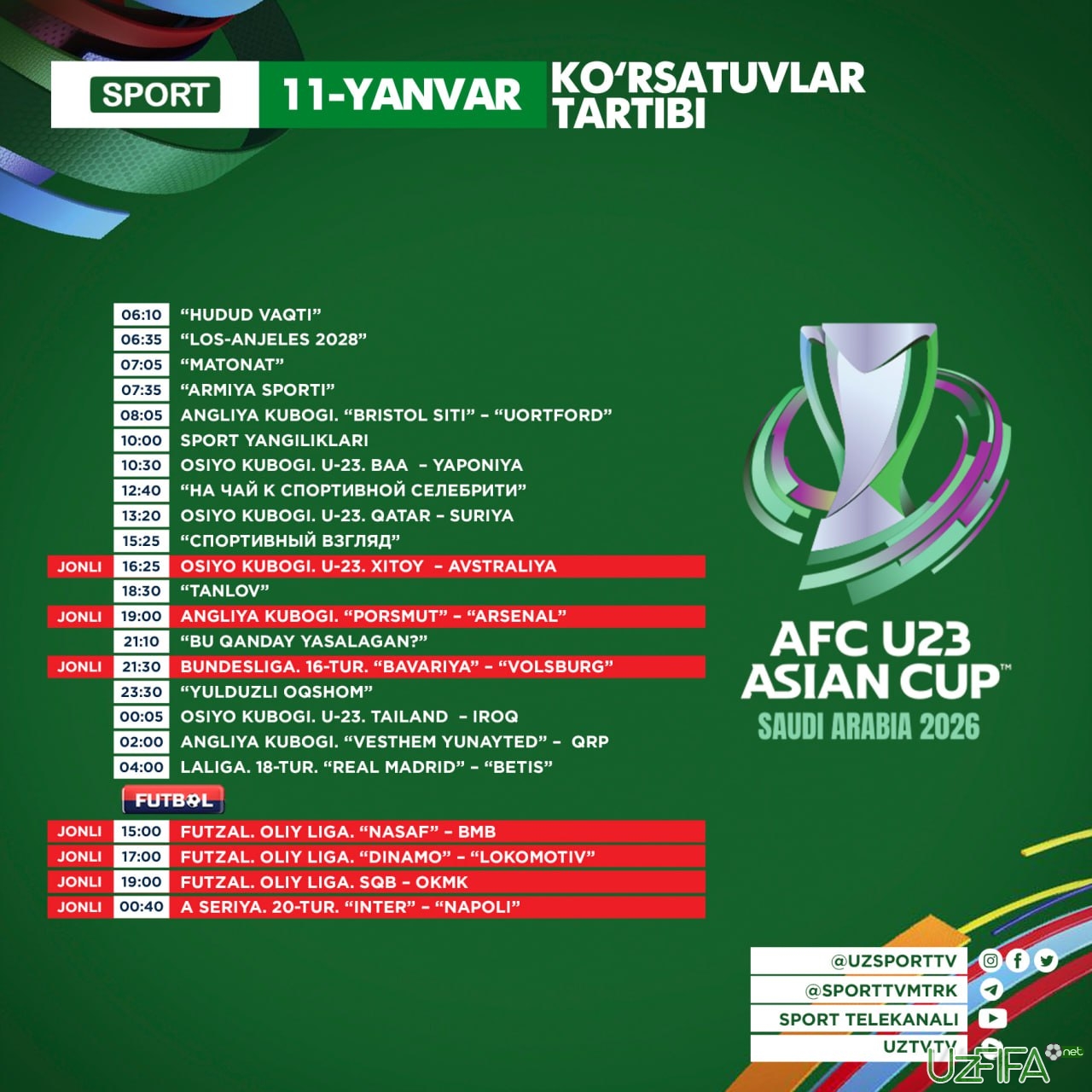 Sport va Futbol telekanallarida 11-yanvar kuni 4 ta futbol va 3 ta futzal o‘yini jonli translyasiya qilinadi