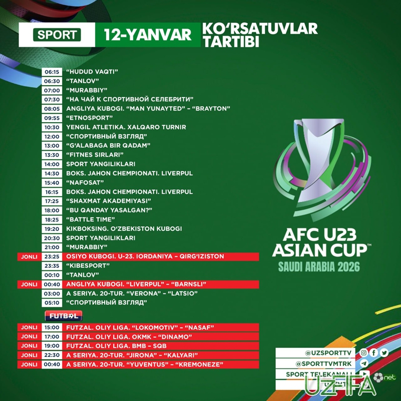 Sport va Futbol telekanallarida 12-yanvar kuni 4 ta futbol va 3 ta futzal o‘yini jonli translyasiya qilinadi