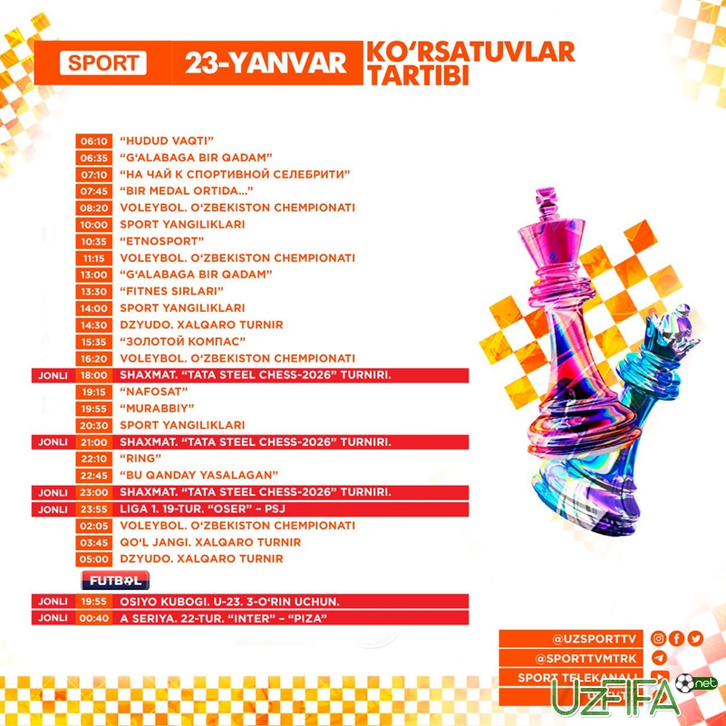 Sport va Futbol telekanallarida 23-yanvar kuni 3 ta futbol va shaxmat musobaqalaridan translyasiyalar bor