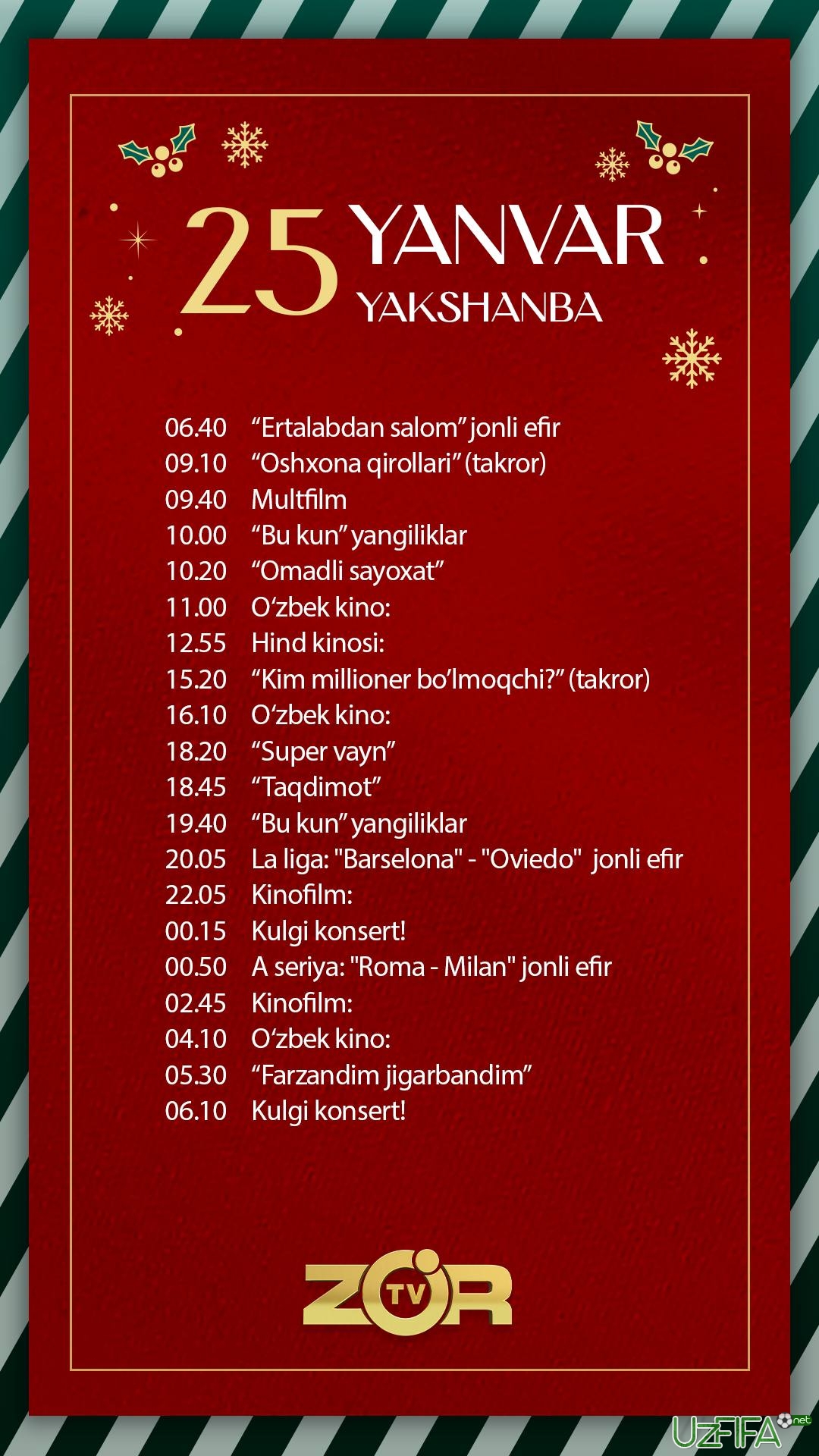 Zo'r TV telekanali 25-yanvar kuni «Barselona» - «Ovyedo» va «Roma» - «Milan» o‘yinlarini jonli translyasiya qiladi