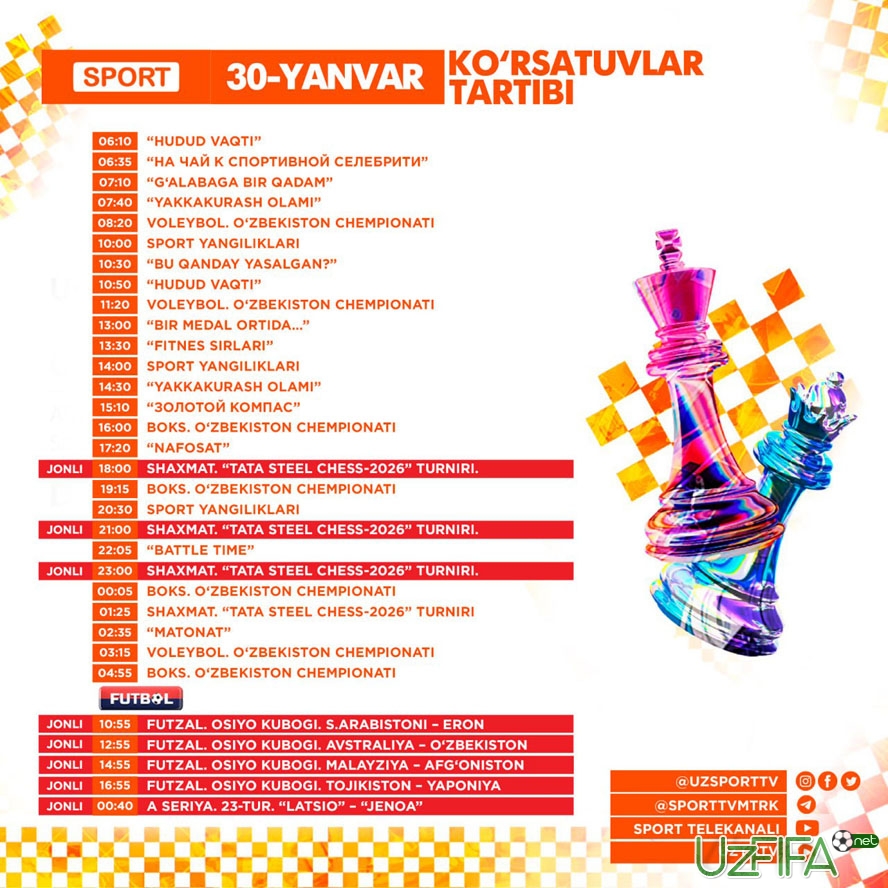 Sport va Futbol telekanallarida 30-yanvar kuni A seriya, futzal bo‘yicha Osiyo kubogi va shaxmat turniridan translyasiyalar bor