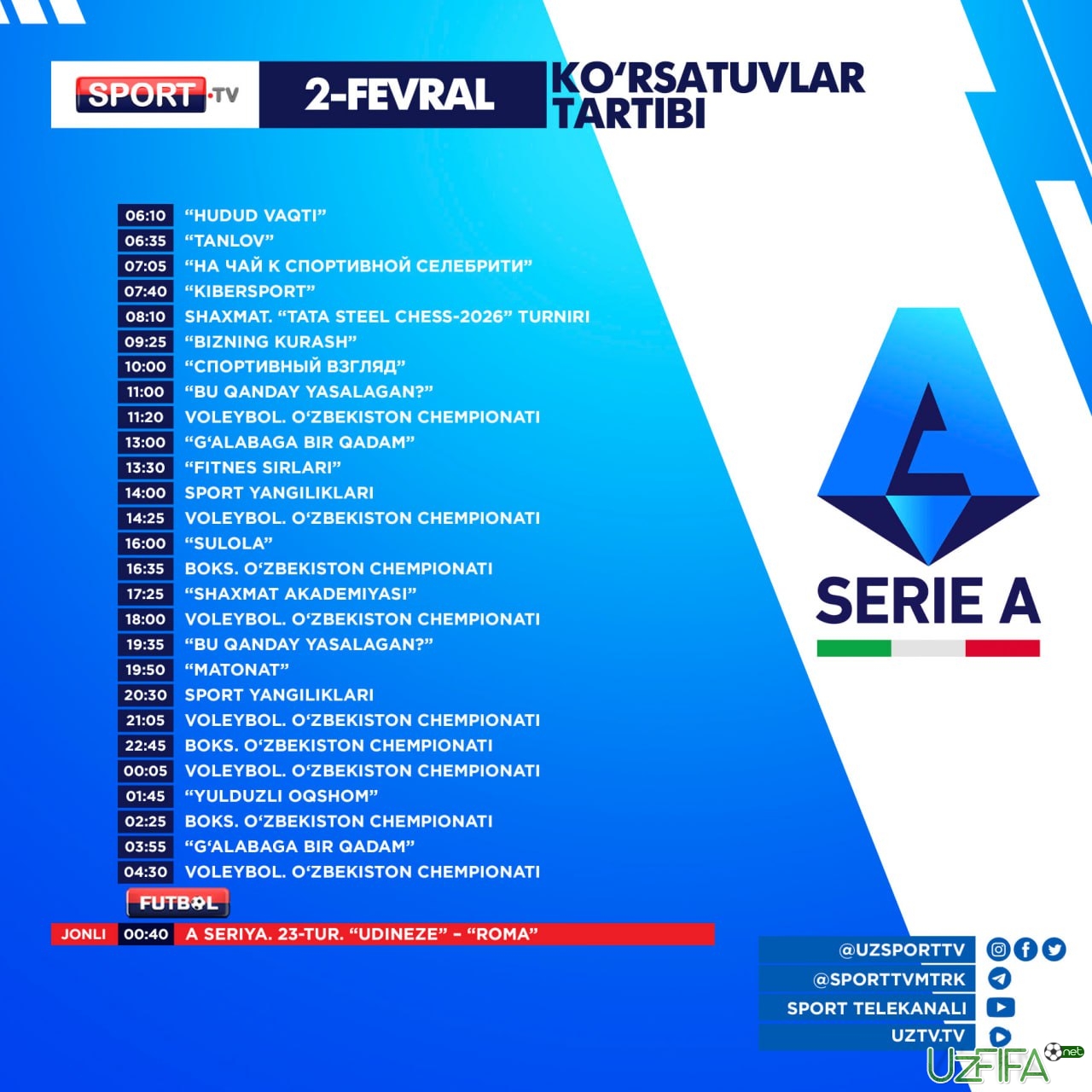 Sport va Futbol telekanallarida 2-fevral kuni A seriyaning bitta o‘yini translyasiya qilinadi
