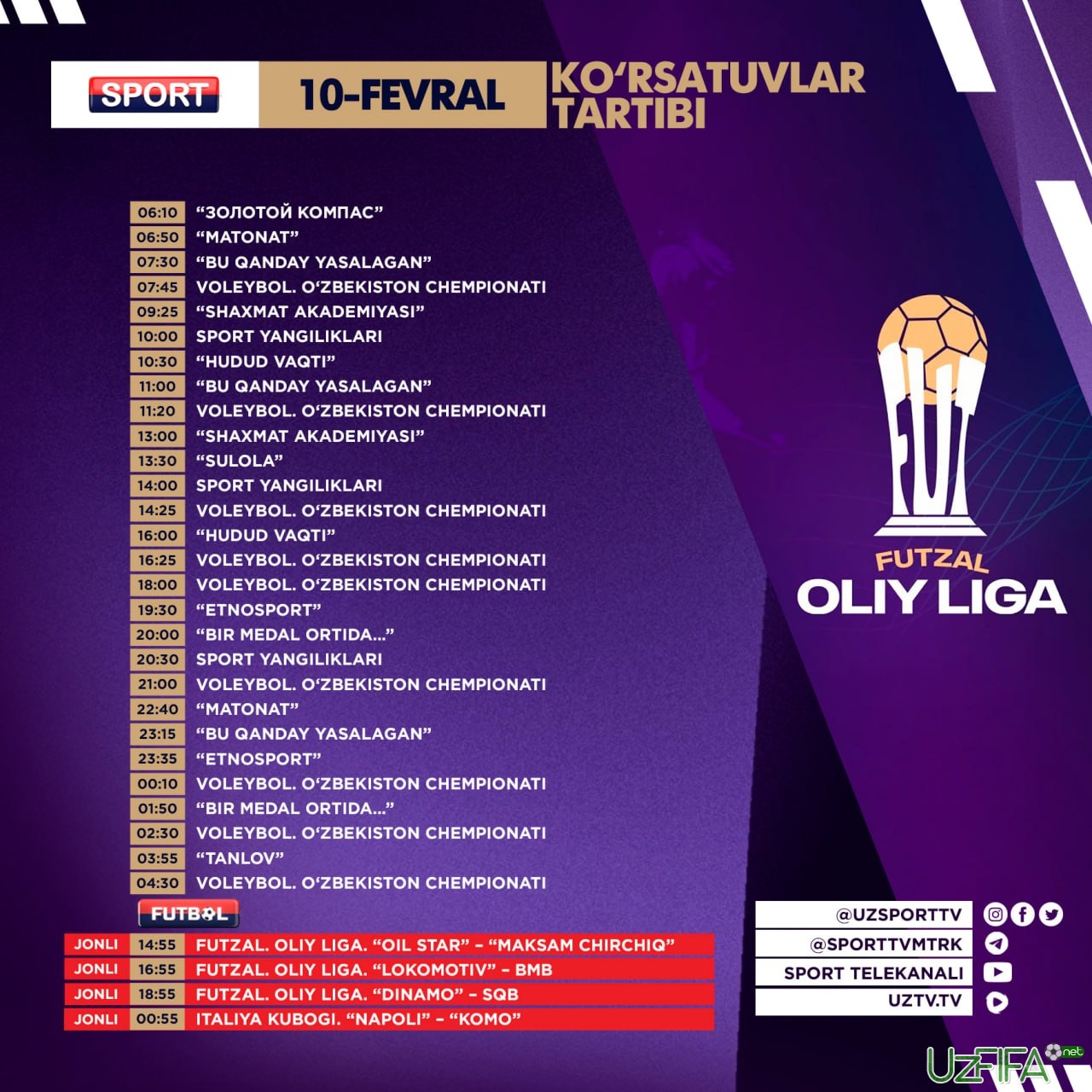 Sport va Futbol telekanallarining 10-fevral kungi ko‘rsatuvlar jadvali