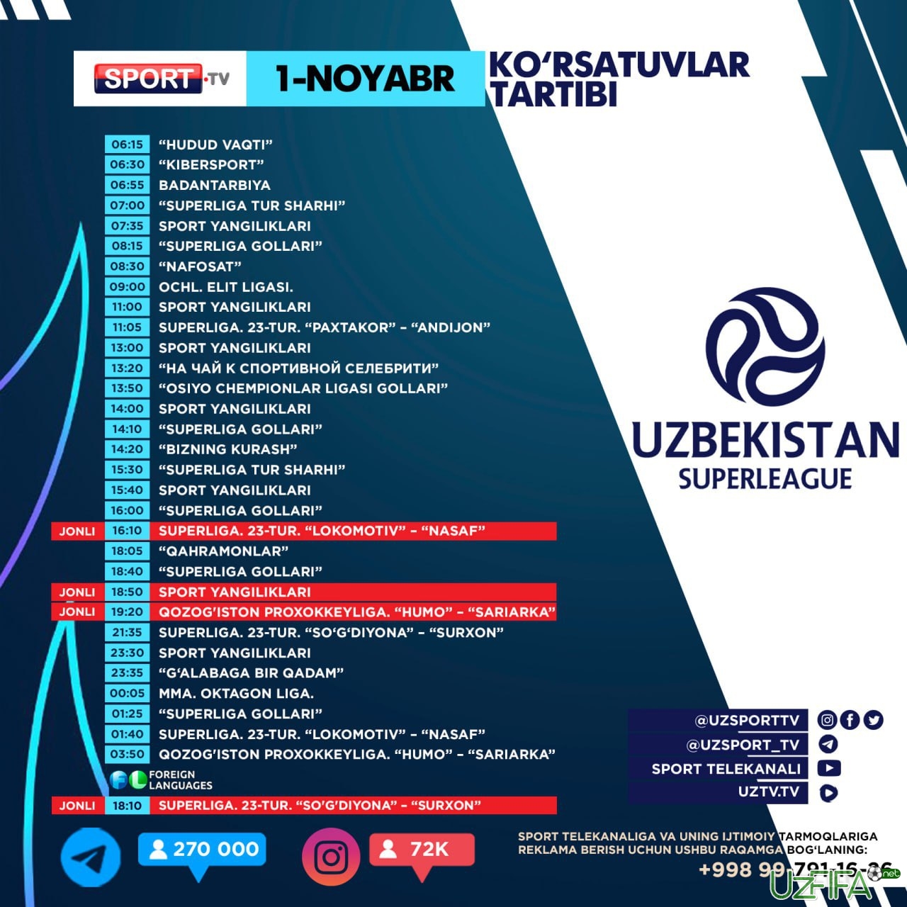 Sport TV'da 1 noyabr kuni 2 ta futbol va 1 ta xokkey jonli translyasiyasi bor