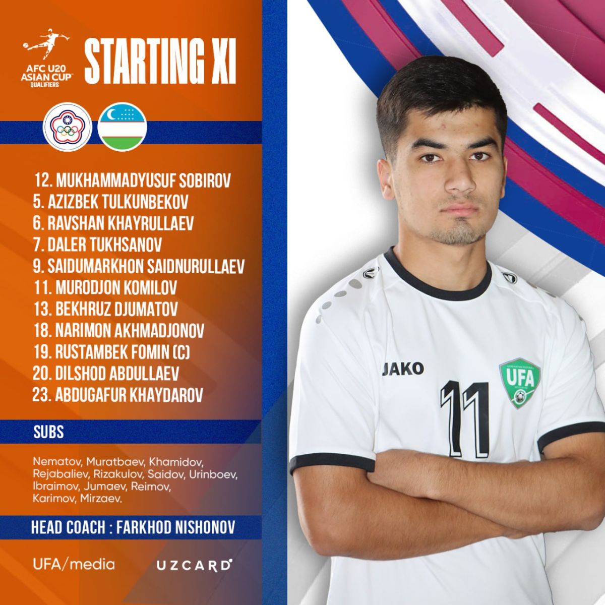 O'zbekiston U-20: 12.Muhammadyusuf Sobirov, 5.Azizbek To'lqinbekov, 6.Ravshan Xayrullaev, 7.Daler Tuxsanov, 9.Saidumarxon Saidnurullaev, 11.Murodjon Komilov, 13.Behruz Jumatov, 18.Narimonjon Ahmadjonov, 19.Rustambek Fomin, 20.Dilshod Abdullaev, 23.Abdug'afur Haydarov.