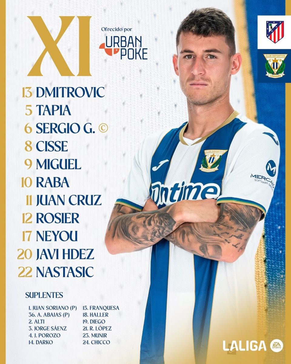 "Leganes": Dmitrovich, Xavi, Nastasich, Serxio Gonsales, Roze, Sisse, Tapiya, Neu, Xuan Krus, Raba, de la Fuente.