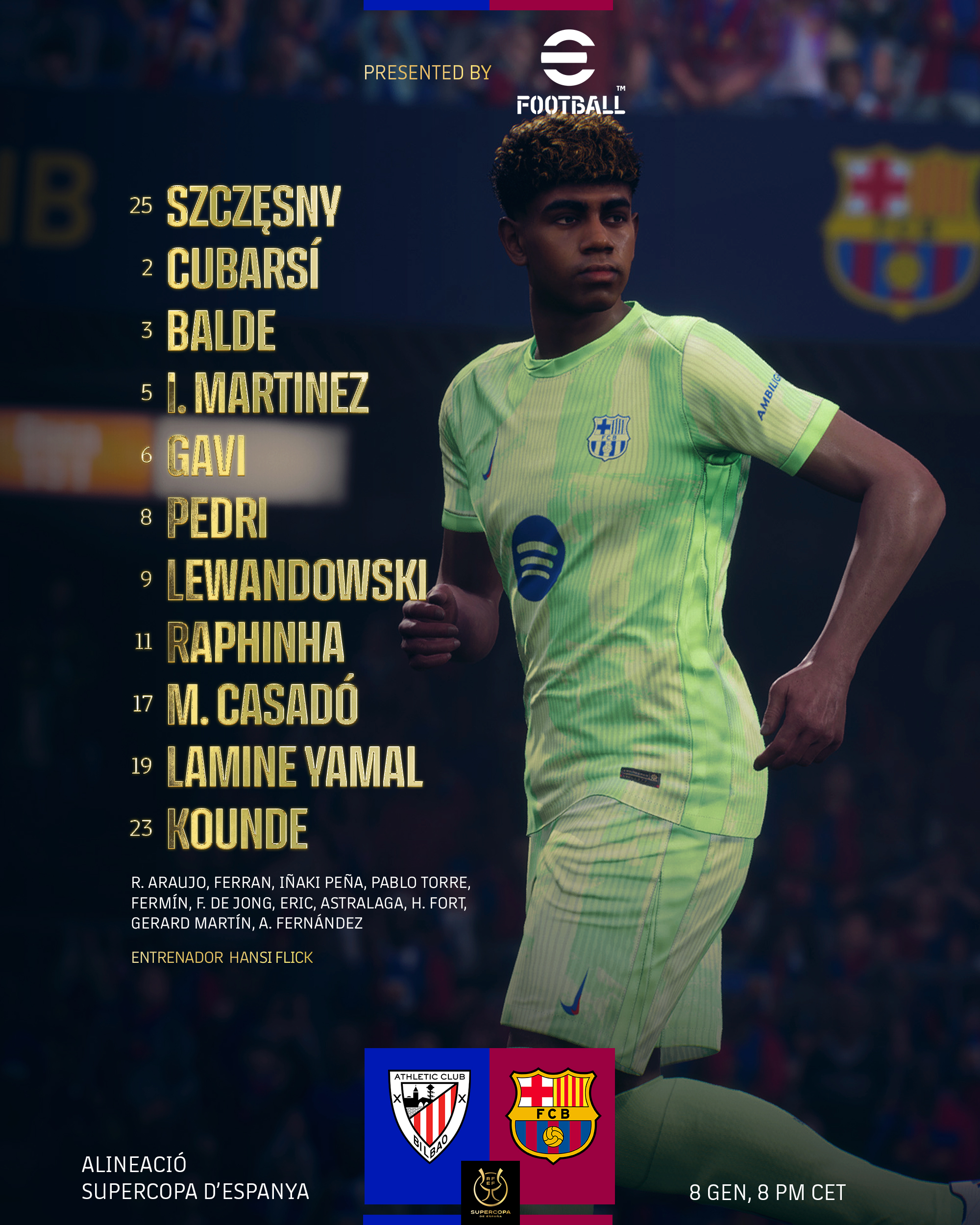 Barselona – SHchensny, Balde, Martines, Kubarsi, Kunde, Pedri, Kasado, Gavi, Rafinya, Yamal, Levandovski.