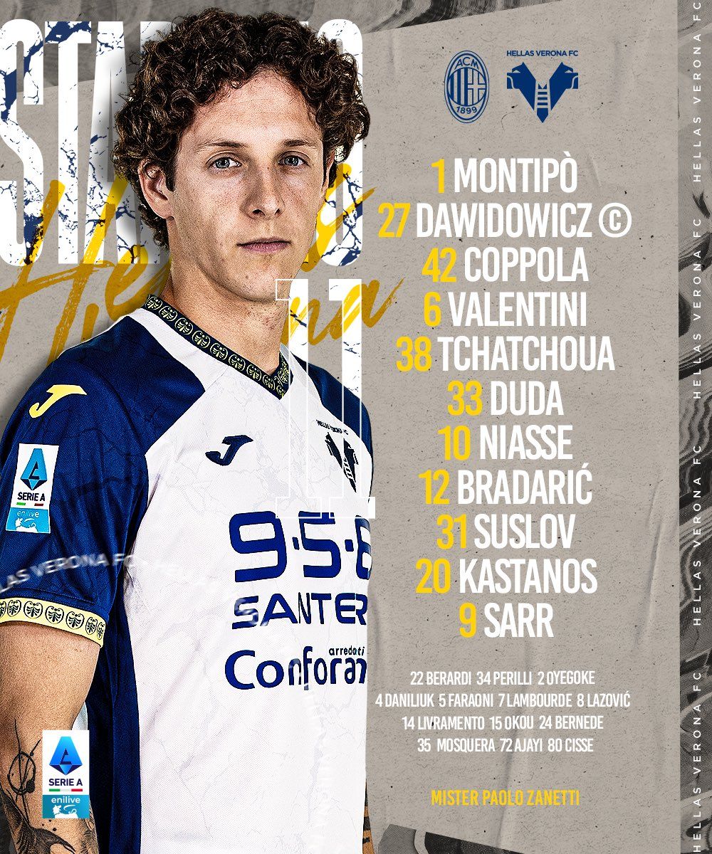Verona - Montipo, Davidovich, Koppola, Valentini, Tchachua, Duda, Niasse, Bradarich, Soslov, Kastanos, Sarr.