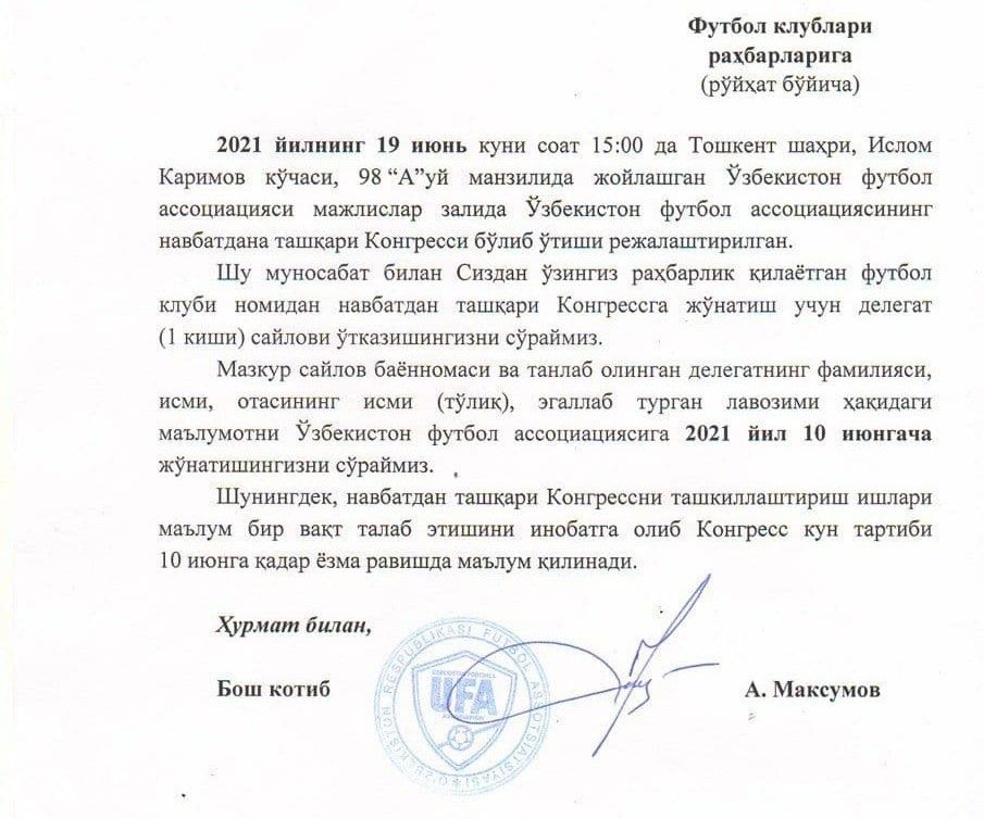 19 iyun kuni O'FA navbatdan tashqari Kongressi o'tkaziladi 2021-06-05 11:40:01 / Kiritdi: BestMaster O'qilgan: 117 Bu haqda O'FA bosh kotibi Avaz Maksumov nomidan klublarga xat yo'llangan. 19 iyun kuni O'FA binosida O'zbekiston futbol Associaciyasining navbatdan tashqari Kongressi bo'lib o'tadi.Ushbu kongressda aynan qanday masala ko'tarilishi borasida aniq malumot hozircha yo'q. Teglar: iyun, kuni, navbatdan, tashqari, kongressi, otkaziladi, ← OldingaOrqaga →