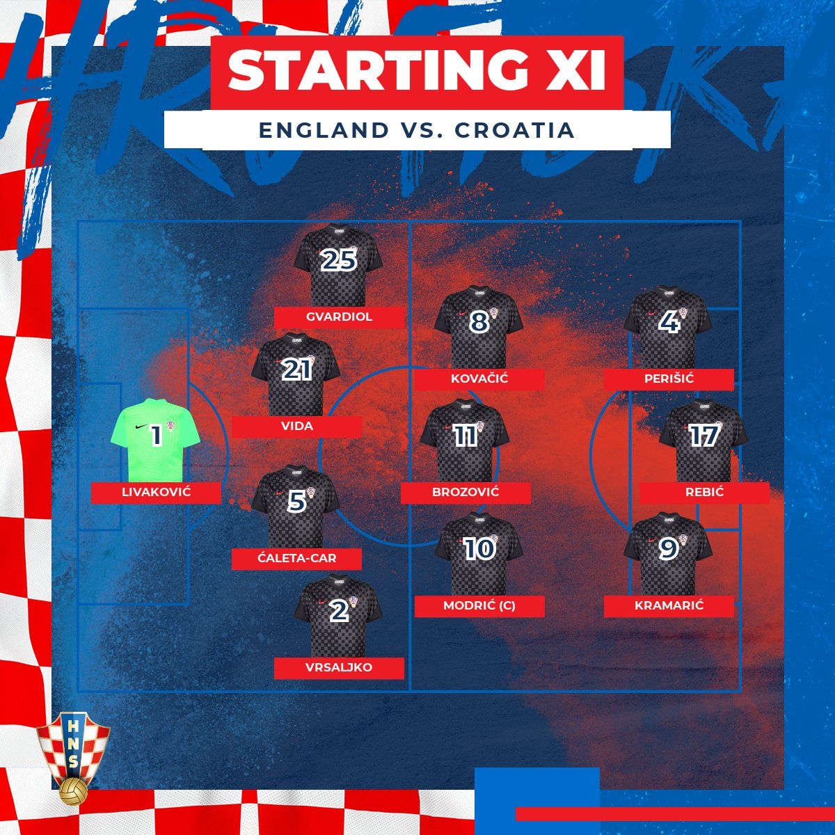 Xorvatiya - 1. Dominik Livakovich, 25. Yoshko Gvardiol, 21. Domagoy Vida, 5. Due CHaleta-Car, 2. Sime Vrsalko, 8. Mateo Kovachich, 11. Marselo Brozovich, 10. Luka Modrich, 4. Ivan Perishich, 17. Ante Rebich, 9. Andrey Kramarich.