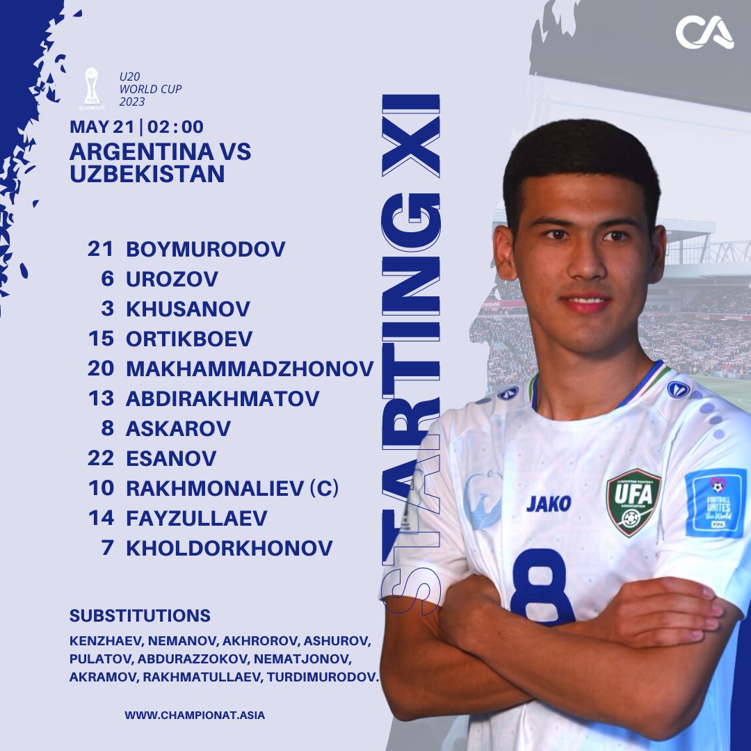 O'zbekiston U-20: 21.Otabek Boymurodov, 3.Abduqodir Husanov, 6.Jahongir O'rozov, 7.Po'latxo'ja Xoldorxonov, 8.Behruzbek Asqarov, 10.Umarali Rahmonaliev (s), 11.SHerzod Esanov, 13.Zafarmurod Abdirahmatov, 14.Abbos Fayzullaev, 15.Diyorbek Ortiqboev, 20.Mahmudjon Mahamadjanov