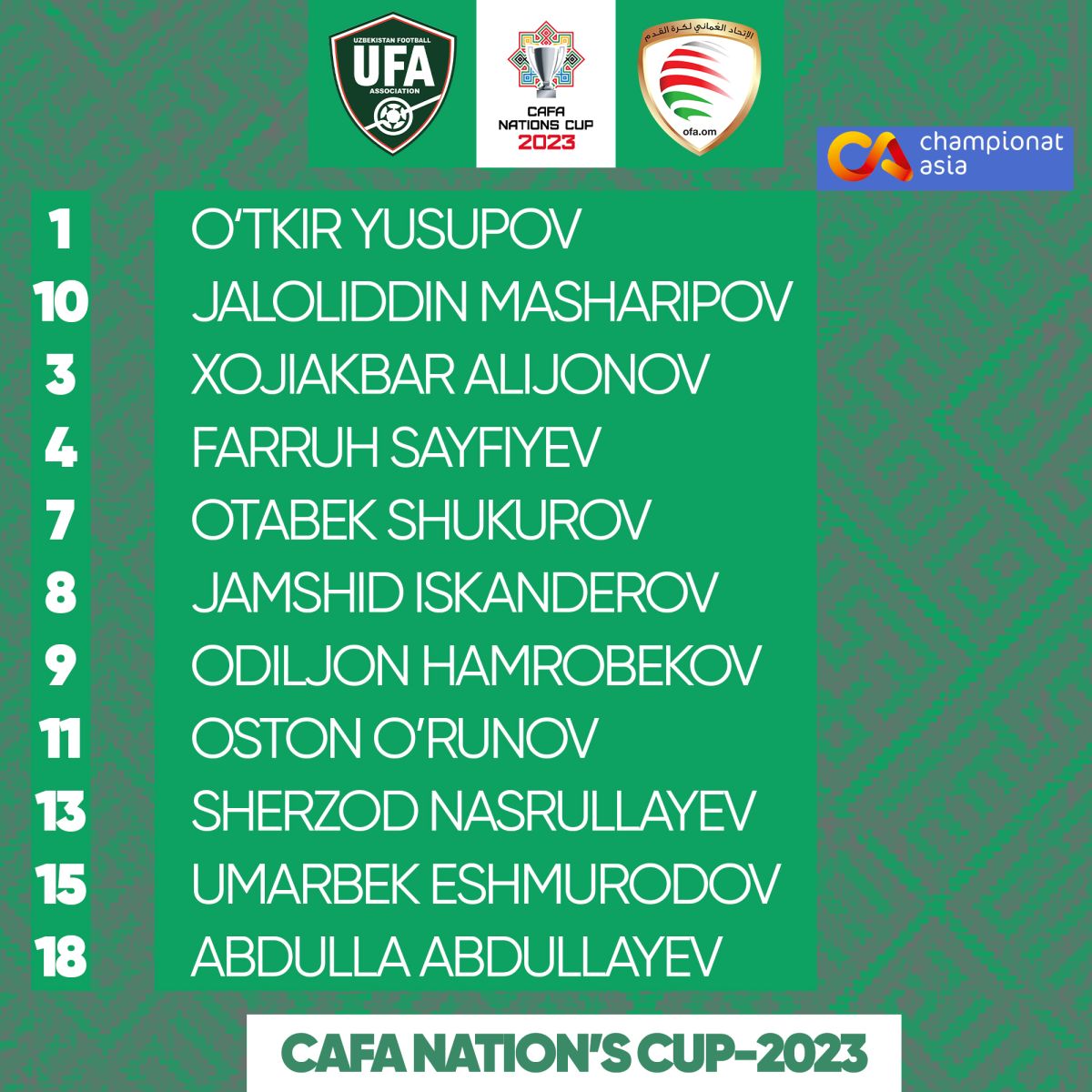 O'zbekiston: 1.O'tkir Yusupov, 10.Jaloliddin Masharipov, 3.Hojiakbar Alijonov, 4.Farruh Sayfeiv, 7.Otabek SHukurov, 8.Jamshid Iskanderov, 9.Odiljon Hamrobekov, 11.Oston O'runov, 13.SHerzod Nasrullaev, 15.Umarbek Eshmurodov, 18.Abdulla Abdullaev.
