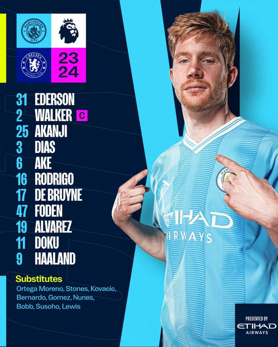 Manchester Siti – Ederson, Uoker, Ake, Ruben Diash, Akanji, Foden, de Bryuyne, Rodri, Holand, Alvares, Doku.