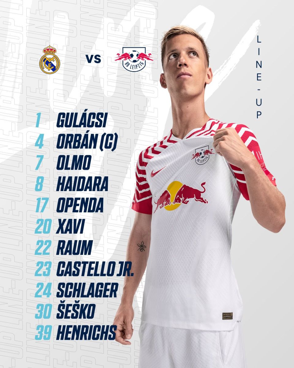 RB Leypcig – Gulachi, Xenrixs, Orban, Lukeba, Raum, SHlager, Olmo, Aydara, Simons, Openda, SHeshko.
