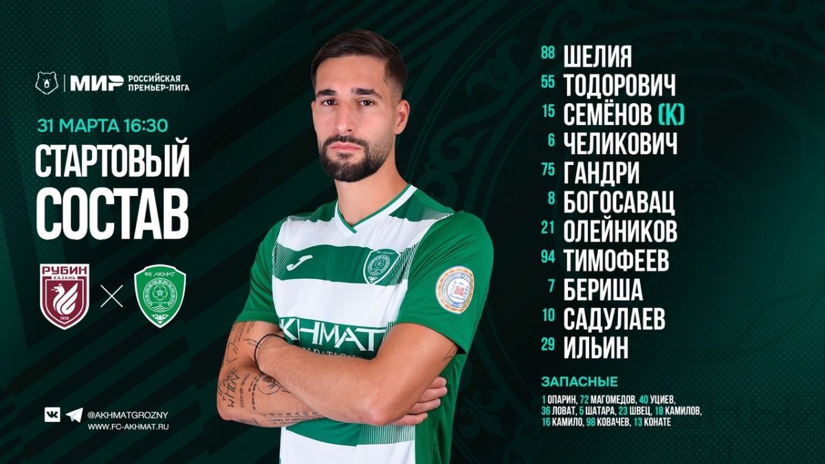 "Axmat": SHeliya, Semyonov, Bogosavac, Todorovich, CHelikovich, Gandri, Timofeev, Oleynikov, Berisha, Sadulaev, Ilin.