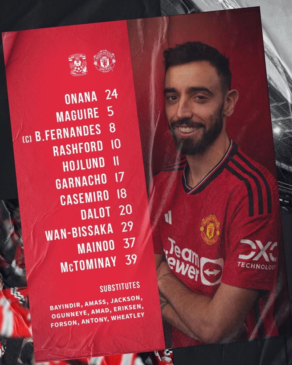 "Manchester Yunayted": Onana, Diogu Dalot, Maguayr, Kazemiro, Van-Bissaka, Brunu Fernandesh, Maktominey, Maynu, Garnacho, Reshford, Xoylund.