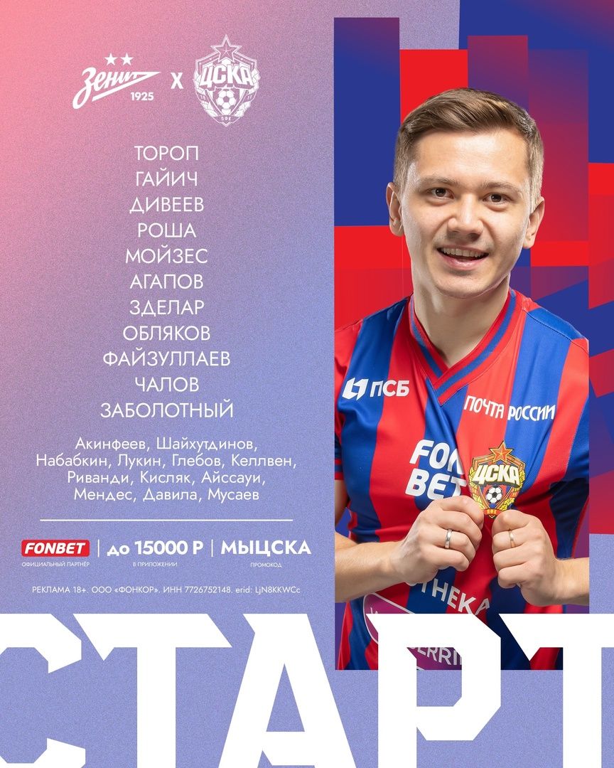 CSKA: Torop, Gayich, Moyzes, Diveev, Villian Rosha, Agapov, Zdelar, Oblyakov, Fayzullaev, Zabolotniy, CHalov.