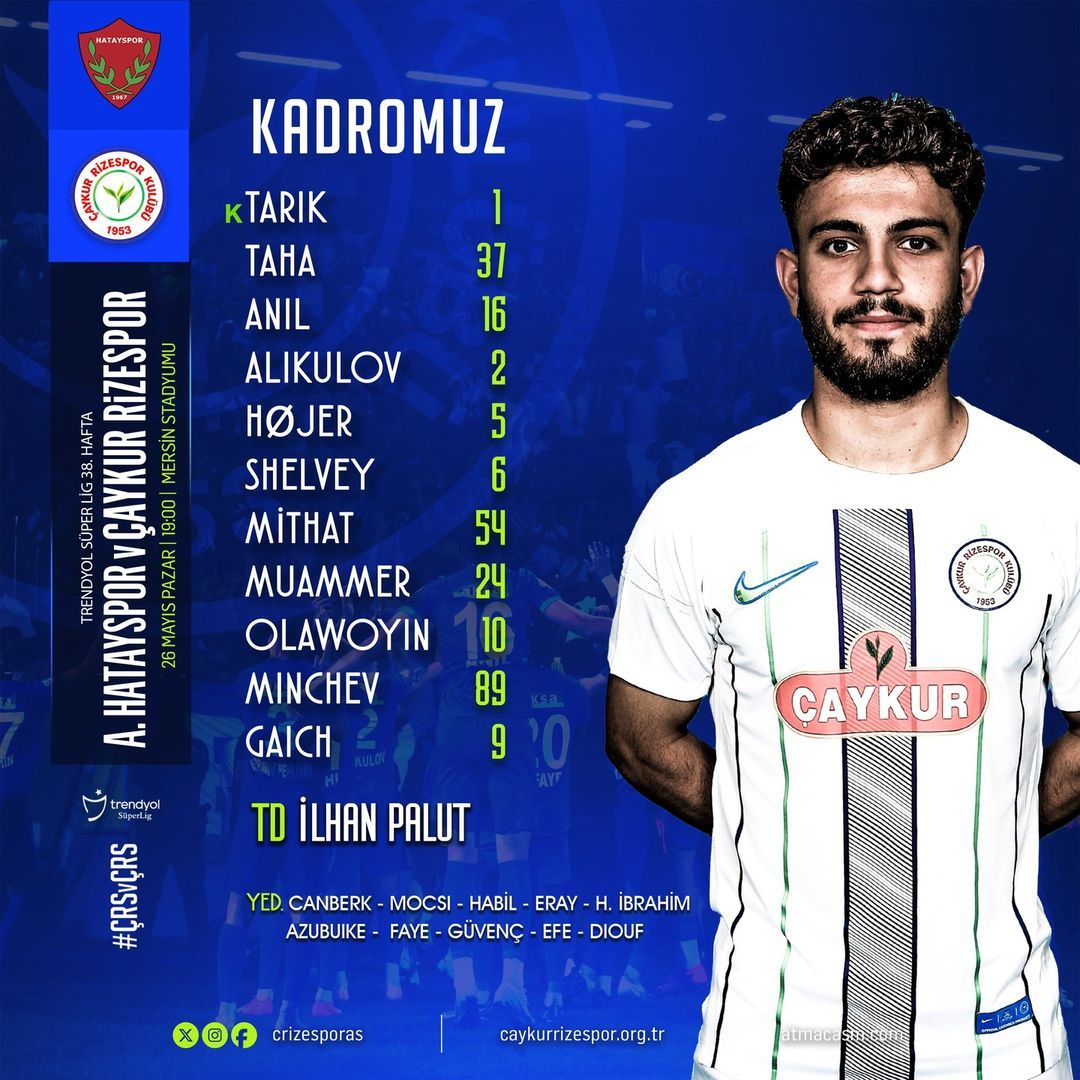 | Hatayspor | Super Lig . 38-tur 26/05/2024, 21:00 - : - Boshlanmadi | Rizespor |
