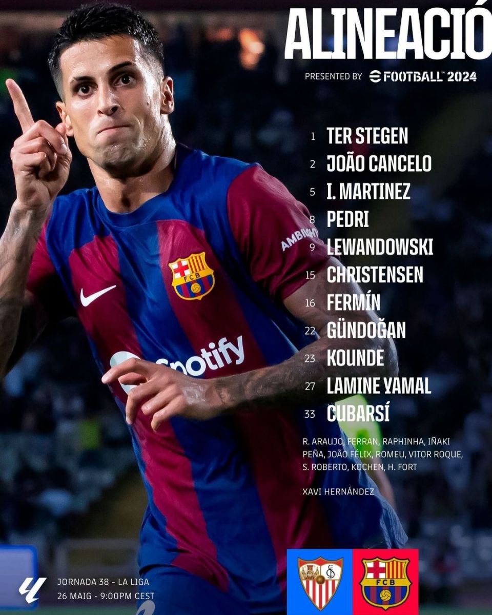 "Barselona": ter SHtegen, Kunde, Martines, Kubarsi, Joau Kanselu, Kristensen, Gyundogan, Pedri, Lopes, Yamal, Levandovski.